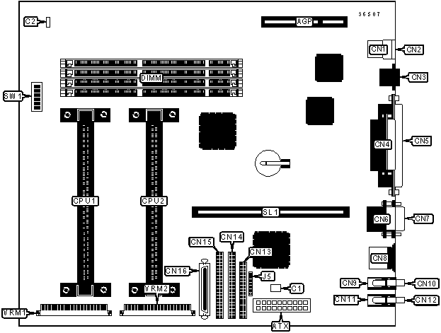 | I/O Options | Ethernet 10BaseT connector, floppy drive interface, IDE interfaces (2), external SCSI interface, Wide Ultra SCSI interface, parallel port, PS/2 mouse port, serial ports (2), VRM connectors (2), USB connectors (2), ATX power connector, AGP slot, line in, line out, microphone in |