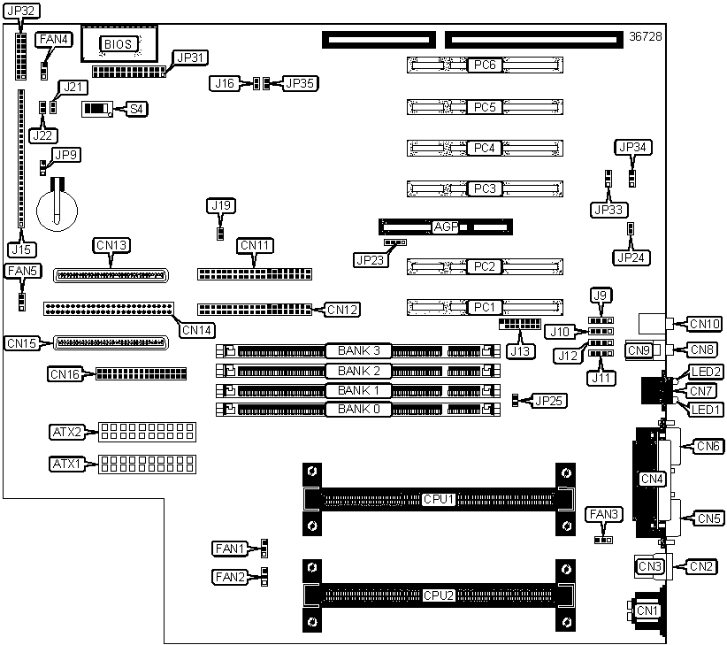 | CPU 2 fan power | FAN2 | 32-bit PCI slots | PC1 - PC6 |